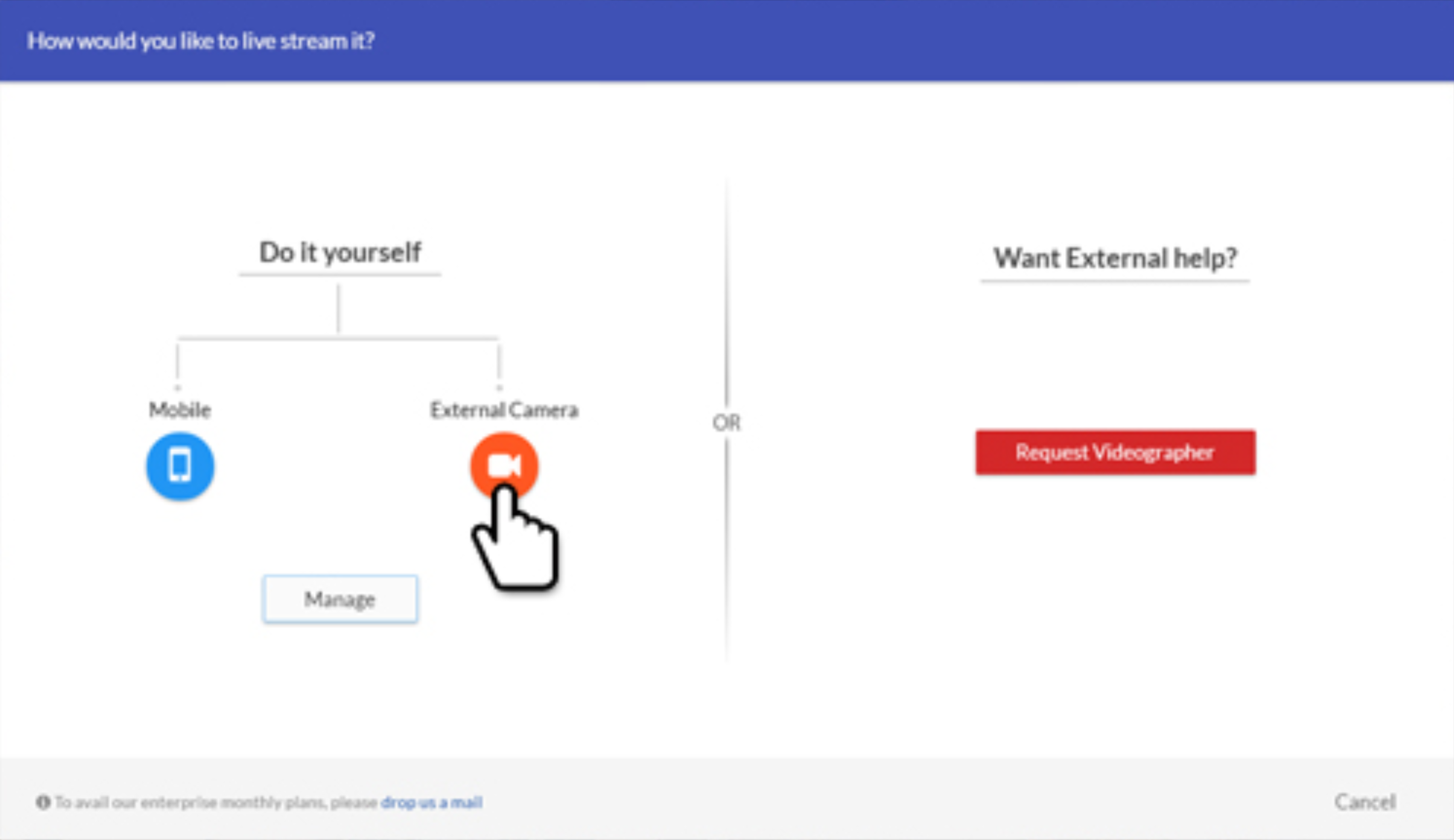 Clients have two livestreaming modes – 'Do-it-Yourself' free to use for advance users and the latter 'Hire-a-Videographer' enables you to request professional videographer who comes to your event location(Uber-esque) on the click of a button to livestream and record the event.