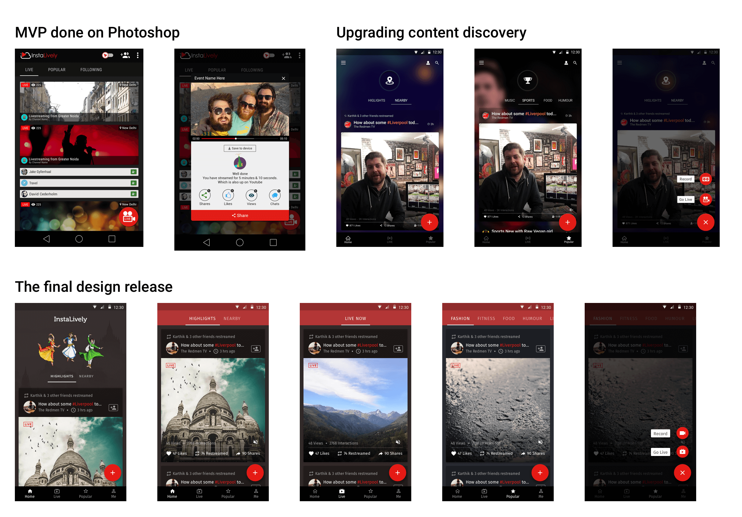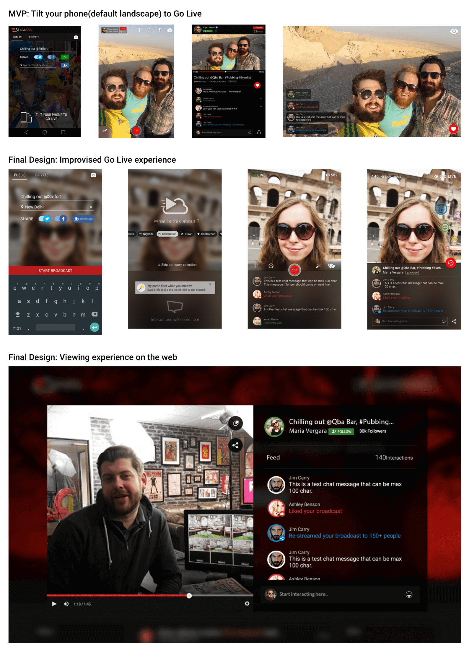 It was the mobile B2C app that we concentrated the most, because why not? This is the space where we’d acquire users in mass and spread the Livestreaming awareness as the world goes mobile 1st and phone cameras get more powerful. Adding comparision from MVP to the final design release of the mobile app -